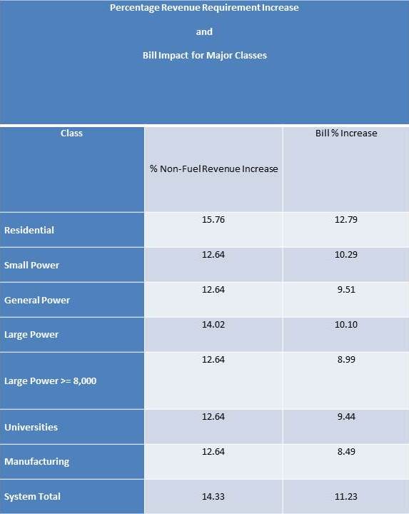 The proposed rate increase would result in an overall bill impact to the residential customer rate class of 12.79%. The system average bill impact for all rate classes is slightly more than 11%.
