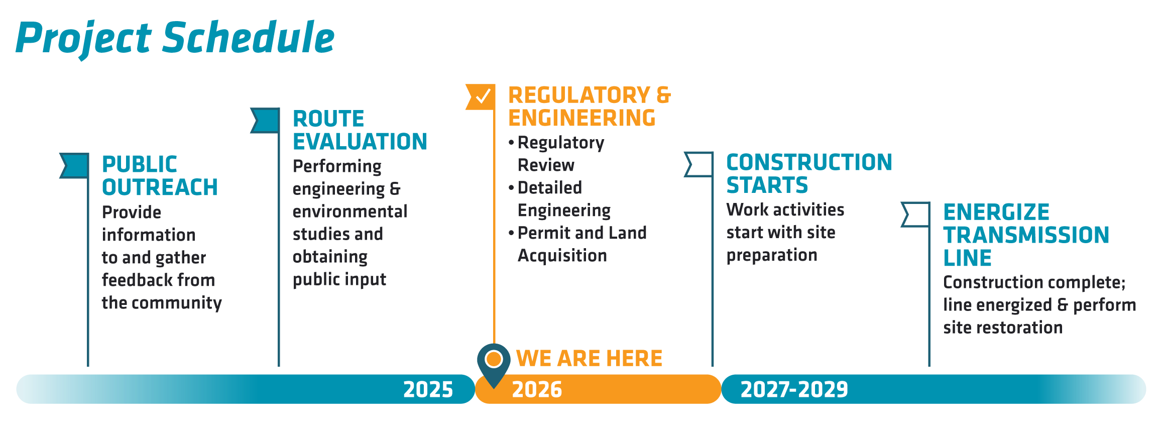 The Rio-PuercoPajaritoProsperity 345kV Transmission Line Project is anticipated to continue through 2029. Below you can see what our expected timeline is.