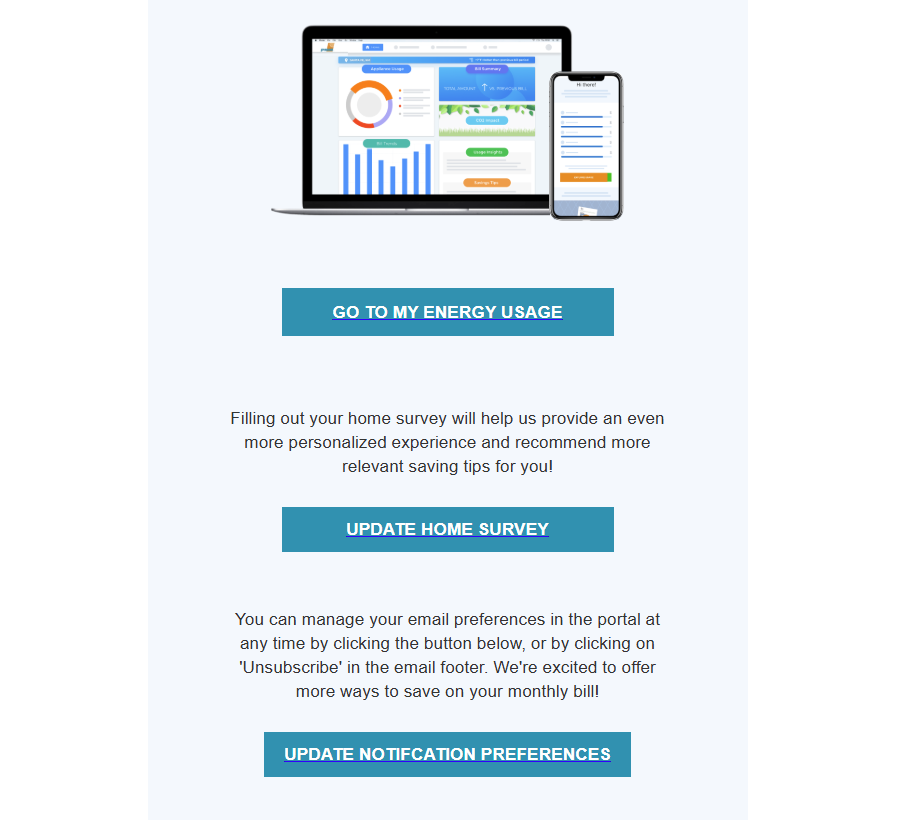 - Monthly Summary Email: Captures how much electricity you used during your last billing period, provides insight into your electricity usage by appliance, and includes tips on how to save.